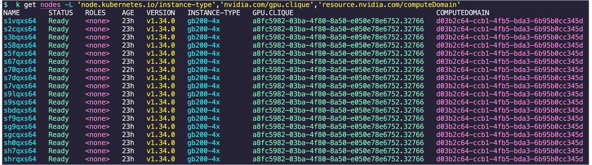$ k get computedomain,resourceclaim,resourceclaimtemplate,resourceslice,ds;NAME AGEcomputedomain.resource.nvidia.com/s0-011-us-west-01a 22hNAME STATE AGEresourceclaim.resource.k8s.io/dra-example-gb200-4x-worker-0-imex-channel-0-5vz5j allocated,reserved 4m3sresourceclaim.resource.k8s.io/dra-example-gb200-4x-worker-1-imex-channel-0-szpkc allocated,reserved 4m3sresourceclaim.resource.k8s.io/dra-example-gb200-4x-worker-10-imex-channel-0-57xxh allocated,reserved 4m2sresourceclaim.resource.k8s.io/dra-example-gb200-4x-worker-11-imex-channel-0-qrzqq allocated,reserved 4m2sresourceclaim.resource.k8s.io/dra-example-gb200-4x-worker-12-imex-channel-0-qz6ld allocated,reserved 4m2sresourceclaim.resource.k8s.io/dra-example-gb200-4x-worker-13-imex-channel-0-gnrst allocated,reserved 4m2sresourceclaim.resource.k8s.io/dra-example-gb200-4x-worker-14-imex-channel-0-r2ccv allocated,reserved 4m1sresourceclaim.resource.k8s.io/dra-example-gb200-4x-worker-15-imex-channel-0-sffsc allocated,reserved 4m1sresourceclaim.resource.k8s.io/dra-example-gb200-4x-worker-16-imex-channel-0-l4l2w allocated,reserved 4m1sresourceclaim.resource.k8s.io/dra-example-gb200-4x-worker-17-imex-channel-0-5445b allocated,reserved 4m1sresourceclaim.resource.k8s.io/dra-example-gb200-4x-worker-2-imex-channel-0-zdwrt allocated,reserved 4m3sresourceclaim.resource.k8s.io/dra-example-gb200-4x-worker-3-imex-channel-0-g62bj allocated,reserved 4m3sresourceclaim.resource.k8s.io/dra-example-gb200-4x-worker-4-imex-channel-0-nm2r8 allocated,reserved 4m3sresourceclaim.resource.k8s.io/dra-example-gb200-4x-worker-5-imex-channel-0-sw48w allocated,reserved 4m3sresourceclaim.resource.k8s.io/dra-example-gb200-4x-worker-6-imex-channel-0-7xq25 allocated,reserved 4m3sresourceclaim.resource.k8s.io/dra-example-gb200-4x-worker-7-imex-channel-0-n8kxc allocated,reserved 4m3sresourceclaim.resource.k8s.io/dra-example-gb200-4x-worker-8-imex-channel-0-snk6s allocated,reserved 4m3sresourceclaim.resource.k8s.io/dra-example-gb200-4x-worker-9-imex-channel-0-68vvh allocated,reserved 4m2sresourceclaim.resource.k8s.io/s0-011-us-west-01a-ws9p4-2mhfk-compute-domain-daemon-hv8p9 allocated,reserved 4m2sresourceclaim.resource.k8s.io/s0-011-us-west-01a-ws9p4-46bj5-compute-domain-daemon-2plxp allocated,reserved 4m2sresourceclaim.resource.k8s.io/s0-011-us-west-01a-ws9p4-6cxtq-compute-domain-daemon-9z6tz allocated,reserved 4m2sresourceclaim.resource.k8s.io/s0-011-us-west-01a-ws9p4-7dj8z-compute-domain-daemon-gqznf allocated,reserved 4m1sresourceclaim.resource.k8s.io/s0-011-us-west-01a-ws9p4-d46g2-compute-domain-daemon-s6lxj allocated,reserved 4m2sresourceclaim.resource.k8s.io/s0-011-us-west-01a-ws9p4-dclxf-compute-domain-daemon-f8vwt allocated,reserved 4m2sresourceclaim.resource.k8s.io/s0-011-us-west-01a-ws9p4-dh4vl-compute-domain-daemon-mqzgz allocated,reserved 4m1sresourceclaim.resource.k8s.io/s0-011-us-west-01a-ws9p4-dnfb7-compute-domain-daemon-xfp5s allocated,reserved 4m2sresourceclaim.resource.k8s.io/s0-011-us-west-01a-ws9p4-f2c64-compute-domain-daemon-ckbts allocated,reserved 4m1sresourceclaim.resource.k8s.io/s0-011-us-west-01a-ws9p4-jnbct-compute-domain-daemon-zw9jg allocated,reserved 4m1sresourceclaim.resource.k8s.io/s0-011-us-west-01a-ws9p4-l2lzs-compute-domain-daemon-dlj7s allocated,reserved 74sresourceclaim.resource.k8s.io/s0-011-us-west-01a-ws9p4-l5tr8-compute-domain-daemon-nkth6 allocated,reserved 4mresourceclaim.resource.k8s.io/s0-011-us-west-01a-ws9p4-nmg8q-compute-domain-daemon-cslk6 allocated,reserved 4m2sresourceclaim.resource.k8s.io/s0-011-us-west-01a-ws9p4-nvz88-compute-domain-daemon-7dxlp allocated,reserved 4m2sresourceclaim.resource.k8s.io/s0-011-us-west-01a-ws9p4-tpnkg-compute-domain-daemon-bzkpn allocated,reserved 4mresourceclaim.resource.k8s.io/s0-011-us-west-01a-ws9p4-wg82q-compute-domain-daemon-m7xz2 allocated,reserved 4m2sresourceclaim.resource.k8s.io/s0-011-us-west-01a-ws9p4-zc2wf-compute-domain-daemon-r4t9t allocated,reserved 4mresourceclaim.resource.k8s.io/s0-011-us-west-01a-ws9p4-zsg4b-compute-domain-daemon-wmw9x allocated,reserved 4m1sNAME AGEresourceclaimtemplate.resource.k8s.io/imex-channel-s0-011-us-west-01a 22hresourceclaimtemplate.resource.k8s.io/s0-011-us-west-01a-daemon-claim-template-nbscw 22hNAME NODE DRIVER POOL AGEresourceslice.resource.k8s.io/s1vqxs64-compute-domain.nvidia.com-n42kz s1vqxs64 compute-domain.nvidia.com s1vqxs64 10mresourceslice.resource.k8s.io/s2cqxs64-compute-domain.nvidia.com-2vpk9 s2cqxs64 compute-domain.nvidia.com s2cqxs64 10mresourceslice.resource.k8s.io/s3bqxs64-compute-domain.nvidia.com-6zpgz s3bqxs64 compute-domain.nvidia.com s3bqxs64 10mresourceslice.resource.k8s.io/s58qxs64-compute-domain.nvidia.com-ggk54 s58qxs64 compute-domain.nvidia.com s58qxs64 10mresourceslice.resource.k8s.io/s5fqxs64-compute-domain.nvidia.com-h7bct s5fqxs64 compute-domain.nvidia.com s5fqxs64 10mresourceslice.resource.k8s.io/s67qxs64-compute-domain.nvidia.com-m7c7k s67qxs64 compute-domain.nvidia.com s67qxs64 10mresourceslice.resource.k8s.io/s70qxs64-compute-domain.nvidia.com-6mqlg s70qxs64 compute-domain.nvidia.com s70qxs64 10mresourceslice.resource.k8s.io/s7dqxs64-compute-domain.nvidia.com-6m6f5 s7dqxs64 compute-domain.nvidia.com s7dqxs64 10mresourceslice.resource.k8s.io/s7vqxs64-compute-domain.nvidia.com-k6hd6 s7vqxs64 compute-domain.nvidia.com s7vqxs64 10mresourceslice.resource.k8s.io/s9lqxs64-compute-domain.nvidia.com-hd4gk s9lqxs64 compute-domain.nvidia.com s9lqxs64 10mresourceslice.resource.k8s.io/s9sqxs64-compute-domain.nvidia.com-7bt68 s9sqxs64 compute-domain.nvidia.com s9sqxs64 10mresourceslice.resource.k8s.io/sbdqxs64-compute-domain.nvidia.com-shkz9 sbdqxs64 compute-domain.nvidia.com sbdqxs64 10mresourceslice.resource.k8s.io/sf9qxs64-compute-domain.nvidia.com-tscd4 sf9qxs64 compute-domain.nvidia.com sf9qxs64 10mresourceslice.resource.k8s.io/sg9qxs64-compute-domain.nvidia.com-zg89f sg9qxs64 compute-domain.nvidia.com sg9qxs64 10mresourceslice.resource.k8s.io/sgcqxs64-compute-domain.nvidia.com-xf4hx sgcqxs64 compute-domain.nvidia.com sgcqxs