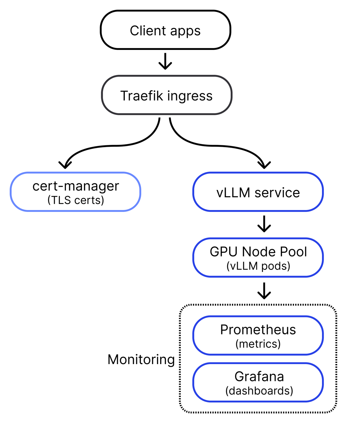 - Traefik ingress: Handles external traffic routing and TLS termination