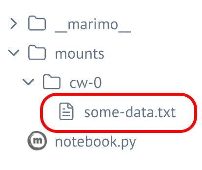 Exampleimport osmount_path = "/home/marimo/notebooks/mounts/cw-0"# List files in the bucketfiles = os.listdir(mount_path)print(f"Files: {files}")TipThe mount supports full read/write access. Any files you create or modify in the mount directory are saved to your S3-compatible bucket.