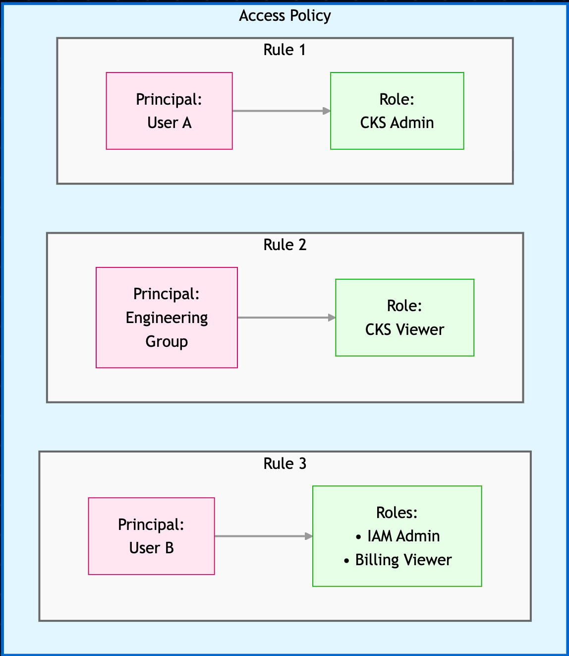 | CKS Admin | Administrative control over Kubernetes resources: create, update, and delete clusters and VPC resources. |
